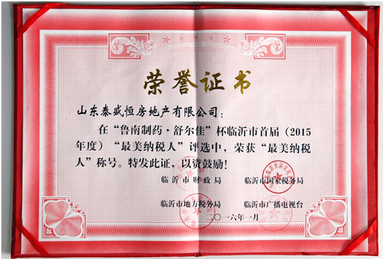近期,泰盛恒地產還被臨沂市蘭山區委、區政府授予2015年度“優秀企業”榮譽稱號;被金雀山街道黨工委授予2015年度“納稅先進企業”榮譽稱號。此外,公司還榮獲由臨沂市廣播電視臺頒發的2015年度臨沂房地產行業“誠信開發企業”、“最具投資價值樓盤”獎牌。各項榮譽的取得,再一次證明了公司的雄厚實力。