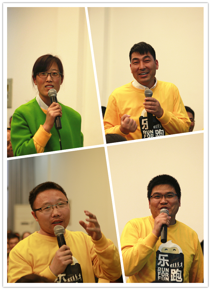 一首《最貴是健康》拉開了本次大會的序幕。首先,趙主席先以“經過這段時間的跑步,大家感覺自己有什么變化嗎?”為切入點進行交流,隨后回顧了公司組織的首屆樂跑賽活動精彩視頻,并讓舒格蘭案場的同事分享了10公里跑步的感想和感悟,由此引出“你是如何看待跑步的”、“你為什么而跑步”等問題讓大家思考、討論。