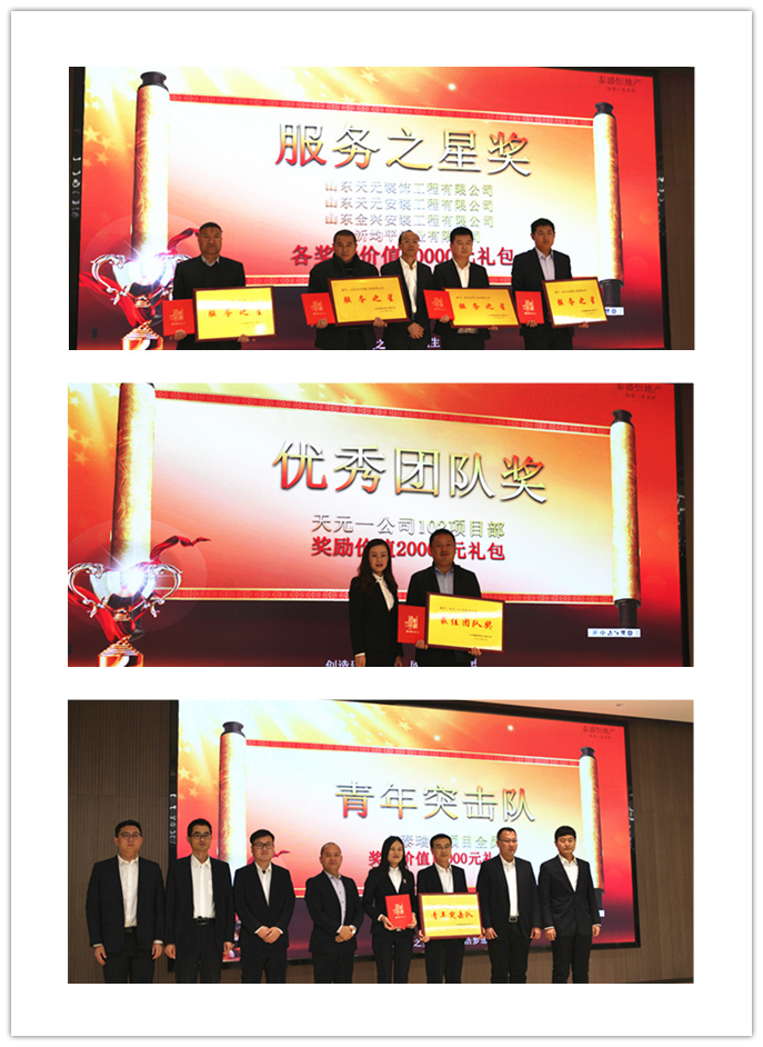 隨后,會議公布了榮獲2019年度服務(wù)之星(山東天元裝飾工程有限公司、山東天元安裝工程有限公司、山東全興安裝工程有限公司、臨沂均平門業(yè)有限公司)、優(yōu)秀團隊獎(天元一公司102項目部)、青年突擊隊獎(金泰瑞府項目)的獲獎單位及項目,并進行現(xiàn)場頒獎。